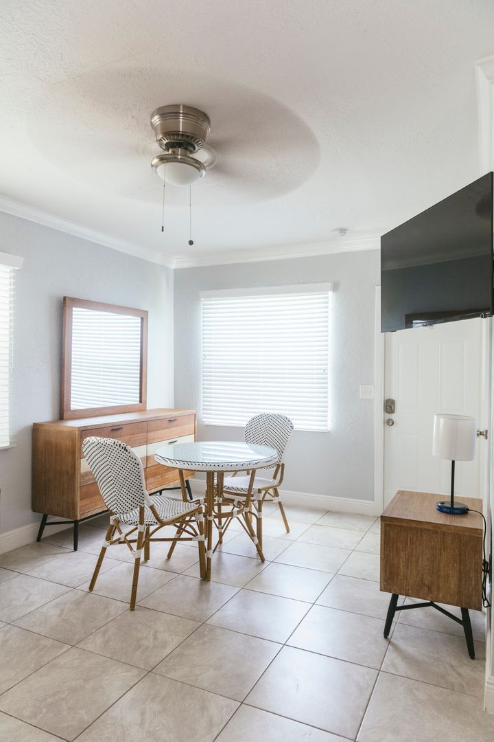 Everything is BRAND NEW in this fully furnished studio suite with two twin beds. The Palm Beach Flamingo is ideally located on the border of West Palm Beach and Lake Worth Beach directly between I-95 and the waterfront near public transportation and surrounded by retail plazas. All units have been completely renovated with a mid-century modern retro look, with red Galanz refrigerators and microwaves. All units come with 4K UHD televisions and high speed Wi-Fi from dedicated fiber optic internet with new air conditioning and hurricane impact windows throughout. There is a courtyard with a picnic table and BBQ.
